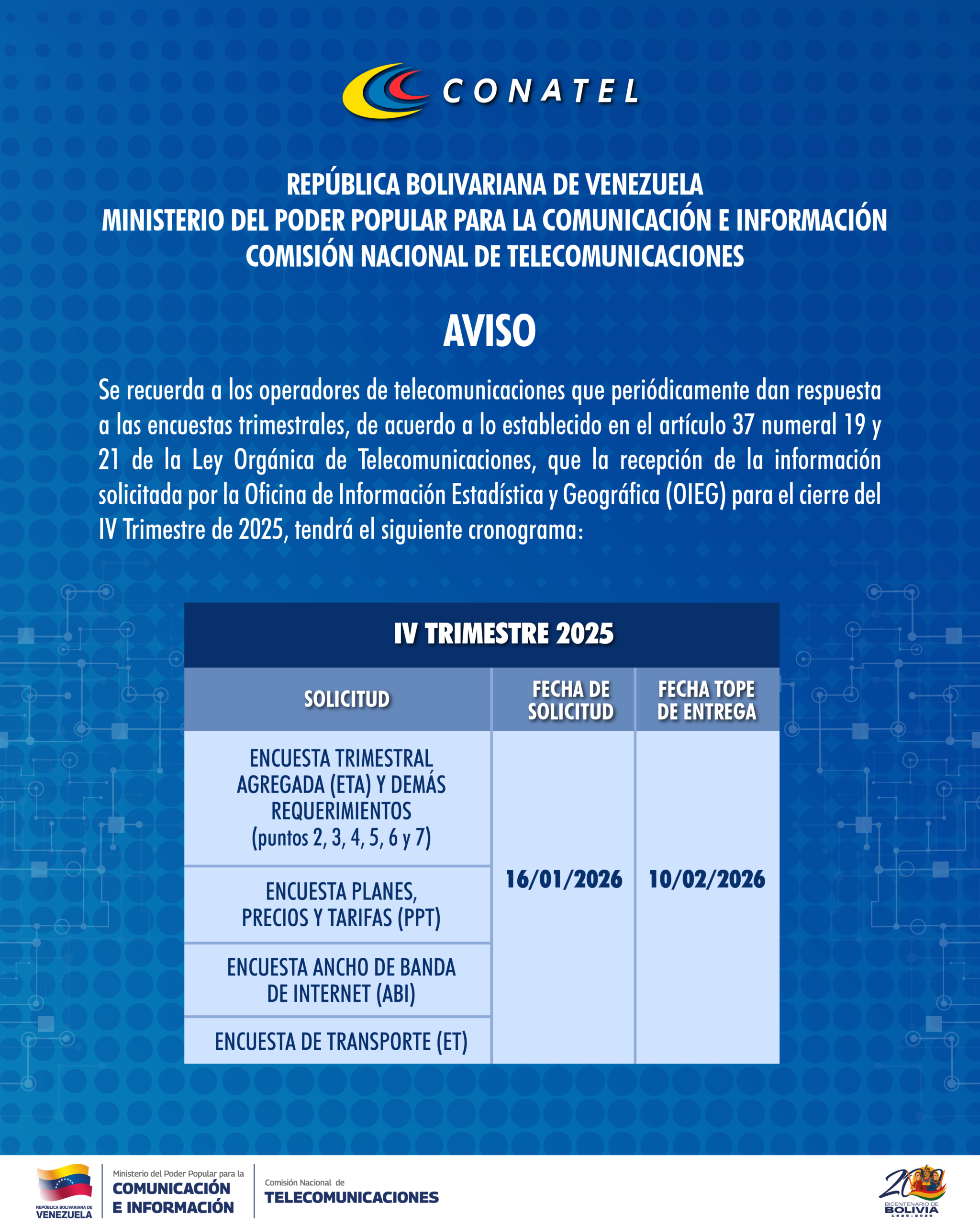 NoticiaTráfico de Internet se nacionaliza: Proyecto IXP Venezuela reduce latencia y costos para el país 26 de diciembre de 2025 / prensa prensa NoticiaDirector General de CONATEL vincula logros en telecomunicaciones a la participación popular impulsada por la Revolución 13 de diciembre de 2025 / prensa prensa NoticiaNuevas organizaciones de usuarios asumen contraloria a las telecomunicaciones en cada rincón de Caracas 12 de diciembre de 2025 / prensa prensa NoticiaCONATEL certifica 25 organizaciones de usuarios y usuarias de las telecomunicaciones en Caracas como símbolo de resistencia 12 de diciembre de 2025 / prensa prensa 1 2 3 … 56 › «Antes de Contratar un Servicio de Telecomunicaciones,verifica si el operador está debidamente habilitado por CONATEL»0800-CONATEL (2662835)